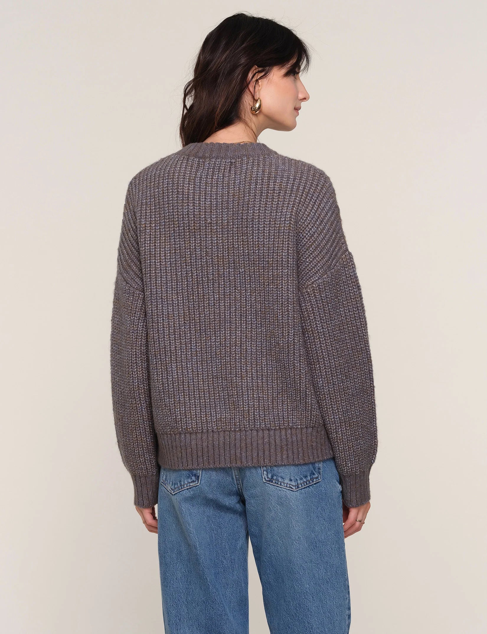 This olive sweater is a relaxed fit, crew neck knit. It has an all over cable stitch and features a top applied, loop cable along the princess seams and onto the arms.