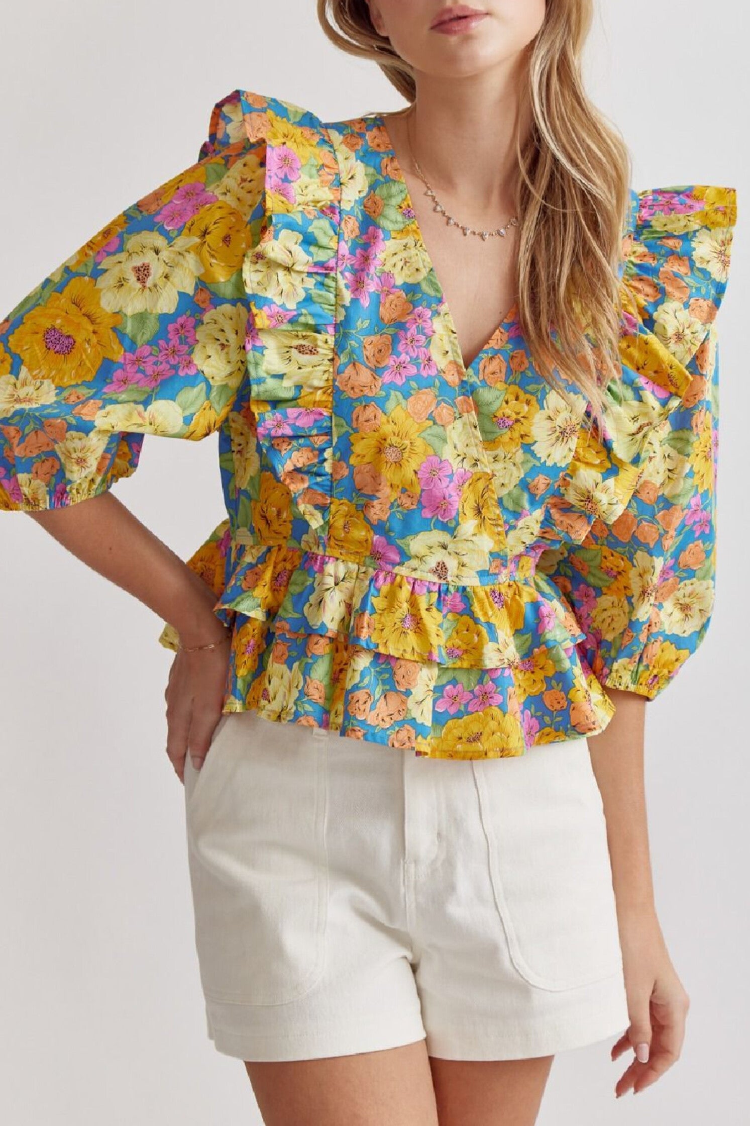 Pair this floral print v-neck peplum top featuring ruffle detail with your favorite jeans or white shorts for a fun elevated look!